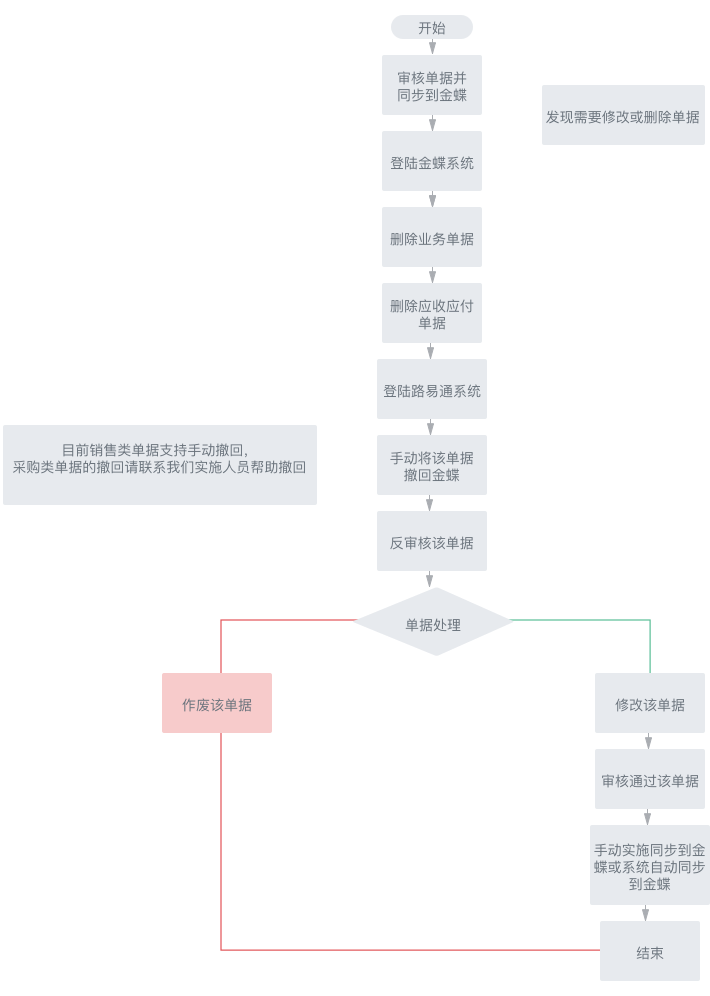 对于销售和采购类单据,如果在单据同步到金蝶以后,需要修改或删除单据,则需要分别在金蝶系统和路易系统中进行删除操作。否则会造成业务数据和财务数据不一致。